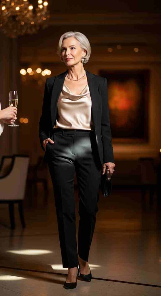Tailored trousers with a silk shell and blazer creates sophisticated evening elegance.