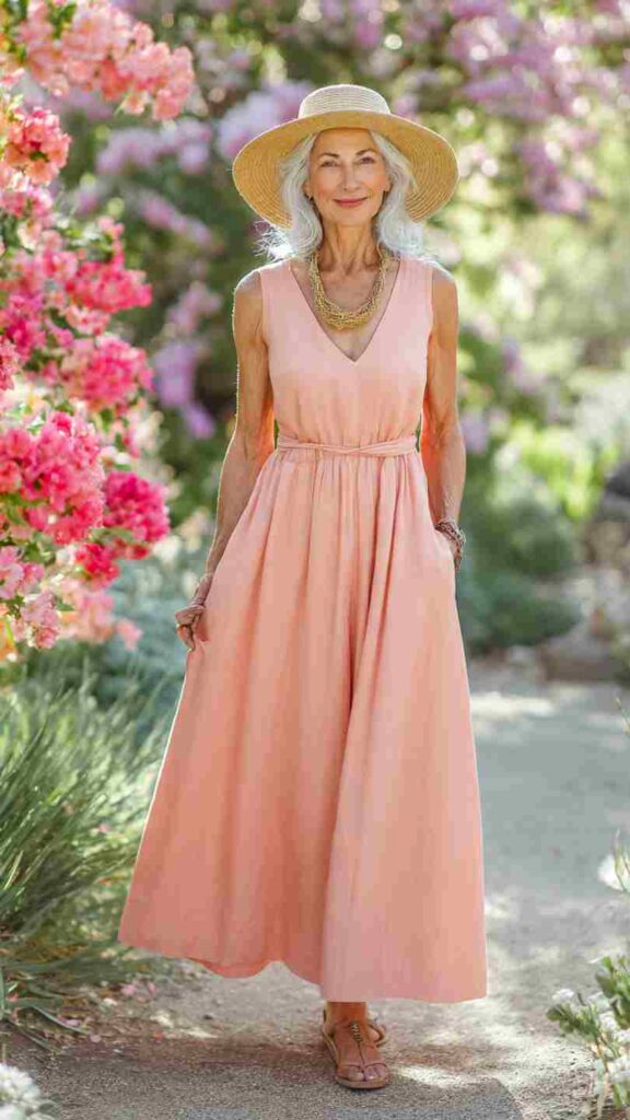 A solid-color maxi dress in breathable fabric offers one-piece simplicity with elegant flow.