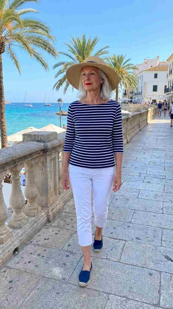 Classic capri pants with a nautical striped top creates timeless coastal elegance.