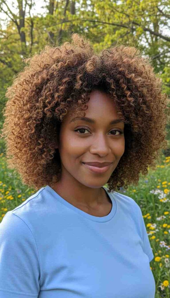 Natural coils defined with curl cream creating voluminous authentic texture celebration.