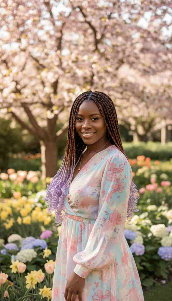 Box braids transitioning from dark roots to pastel spring color at ends.