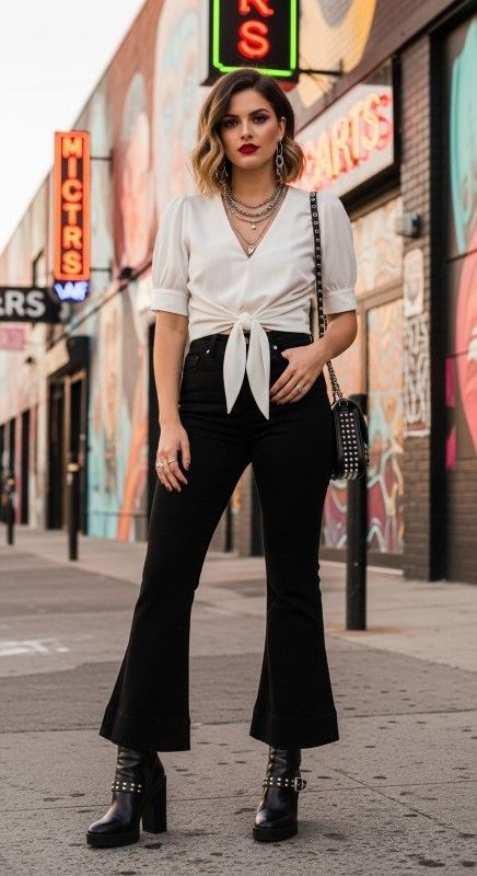 Why It Works: A tie-front blouse creates a flattering V-neckline and adjustable fit, while ankle boots introduce unexpected edge and versatility. This combination bridges casual and dressy, making it perfect for summer evenings or transitional weather.