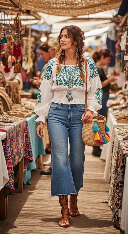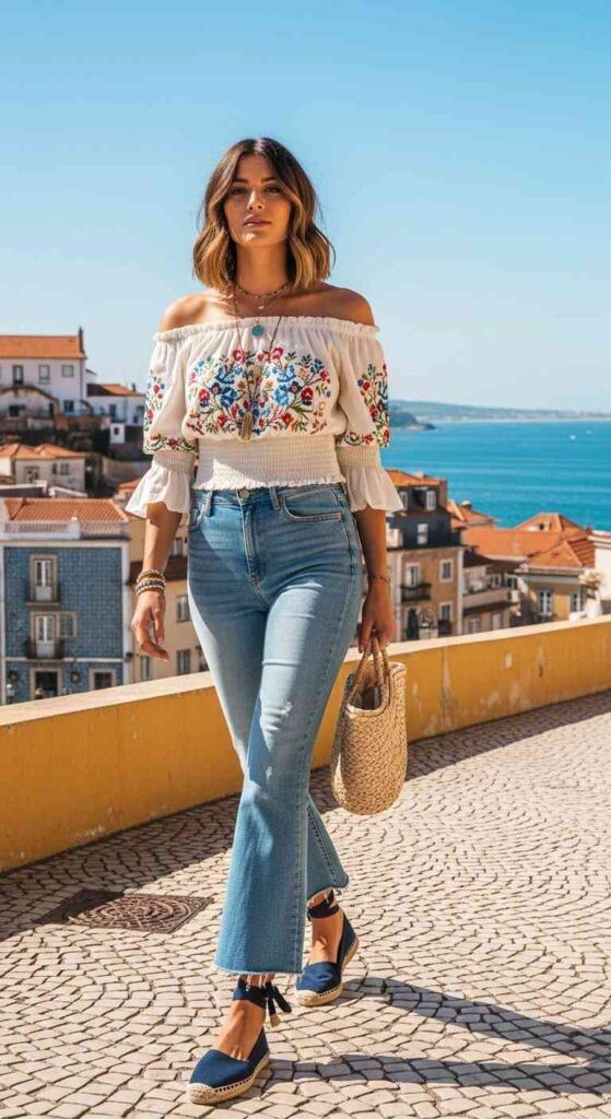Why It Works: This romantic combination features an off-shoulder peasant blouse with artisanal embroidery, paired with classic flare jeans for bohemian charm. Espadrilles add that perfect European summer touch, creating a look that’s free-spirited yet polished.