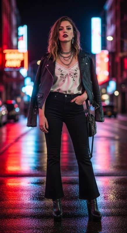 Why It Works: Delicate embroidery on a camisole adds artisanal detail to casual flare jeans, while a lightweight leather jacket introduces edge and versatility for cooler evenings. This combination balances feminine and tough perfectly.