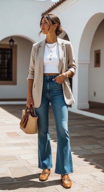 Why It Works: This elevated casual look balances structure and ease perfectly. A lightweight linen blazer adds instant polish to a simple cropped tee, while high-waisted flare jeans create that coveted leg-lengthening silhouette. The contrast between tailored tailoring and relaxed denim creates effortless sophistication that defines modern summer style.