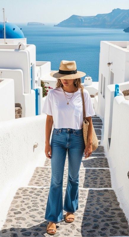 Why It Works: A cropped pocket tee adds casual charm to flare jeans, while a classic straw hat provides sun protection and that perfect summer accessory touch. This combination is breezy, feminine, and effortlessly vacation-ready.