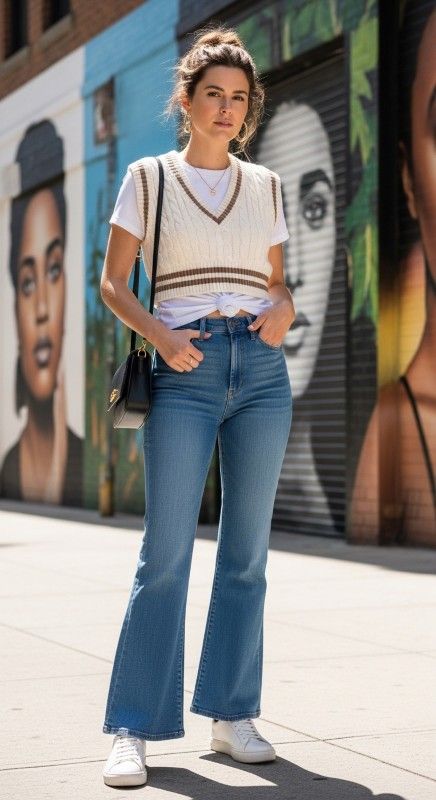 Why It Works: This layered look maximizes versatilityโa simple white tee provides a clean base, flare jeans create flattering proportions, and a cropped knit vest adds texture and visual interest. It’s casual cool with intentional polish, perfect for unpredictable summer weather.