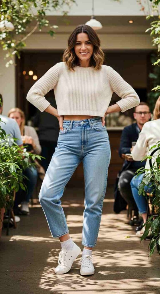 Cropped sweater with high-waist jeans creates May casual-cute balance.