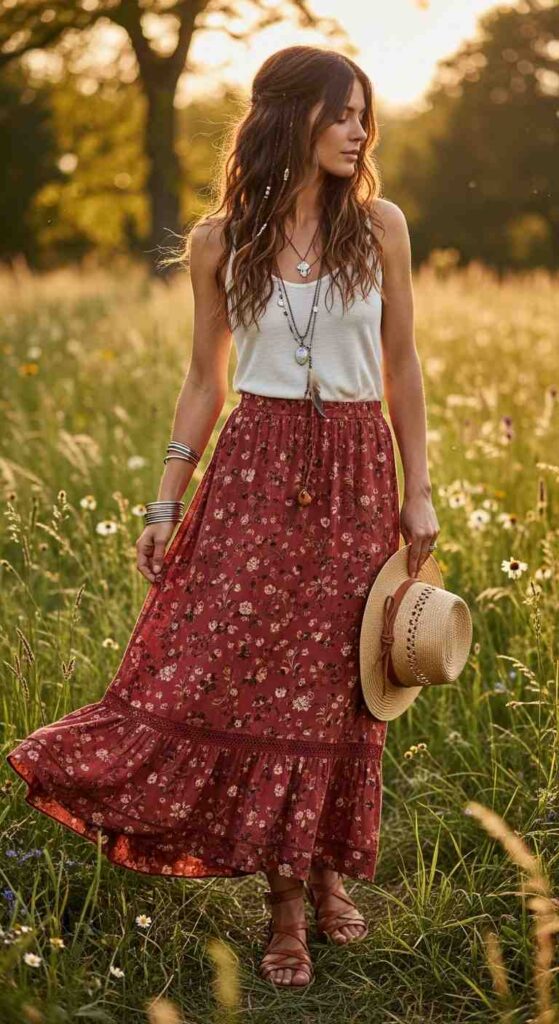 Flowing maxi skirt with simple top creates May bohemian elegance.