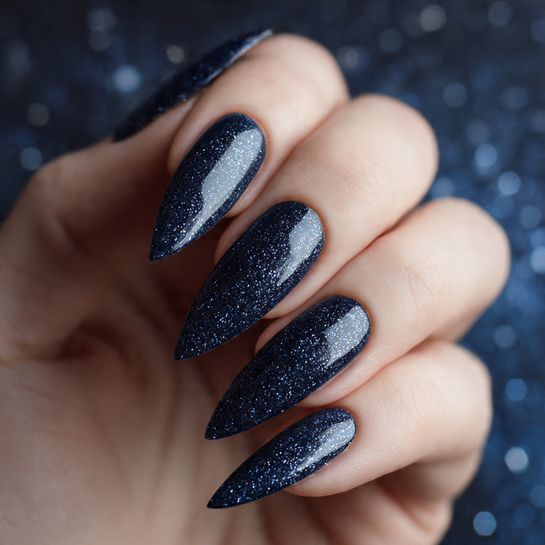 Navy so deep it flirts with black, elevated with microscopic shimmer that catches light like stars on water. This shade is commanding yet wearable for any occasion.