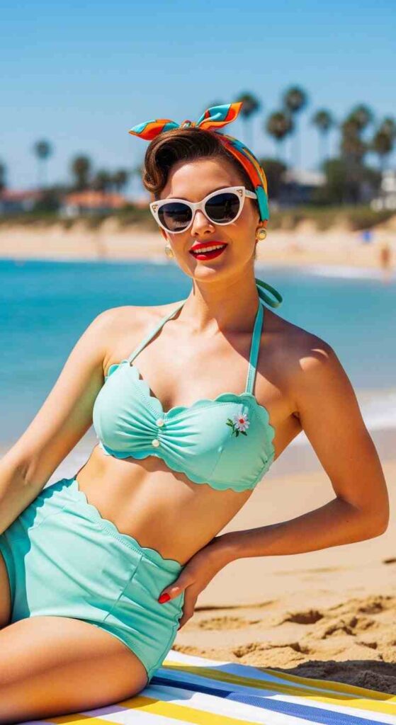 Scalloped trim details create vintage beach femininity.