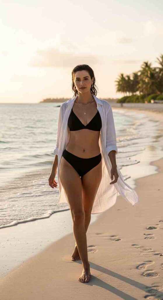 The complete look approach—thinking of beach outfits as complete ensembles rather than just swimsuits ensures you look intentionally styled rather than merely beach-ready.