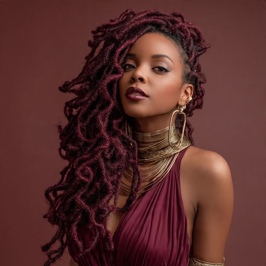 Faux locs offer the aesthetic of mature locs without the long-term commitment. The deep burgundy color adds richness and sophistication, making this protective style a fashion statement.