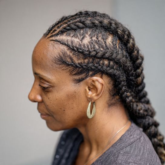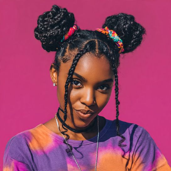 This fun, youthful style features two high buns on either side of the head, with the base created from cornrows or flat twists. It’s playful, practical, and perfect for festivals or creative fashion moments.