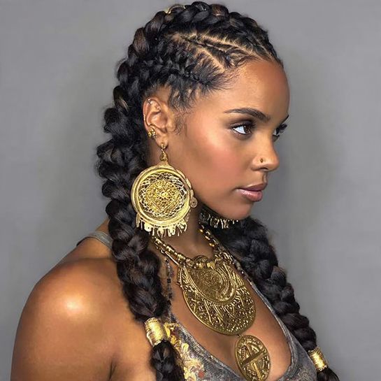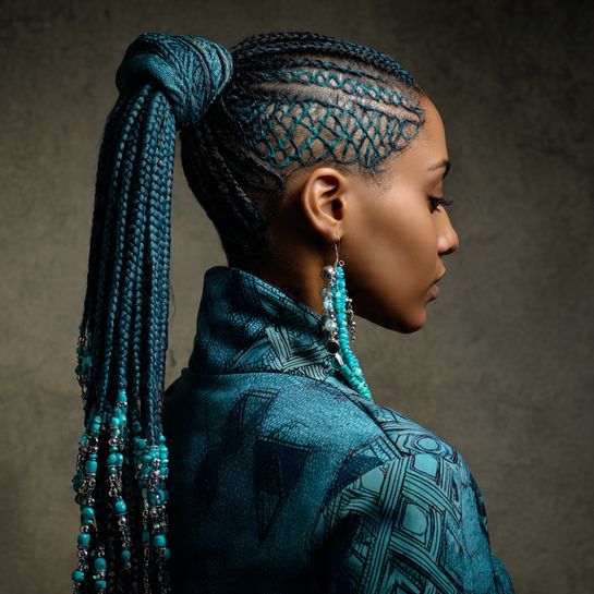 This culturally rich style features cornrows braided toward the back with a signature braid down the center. Metallic cuffs, rings, and beads woven throughout honor traditional West African aesthetics.