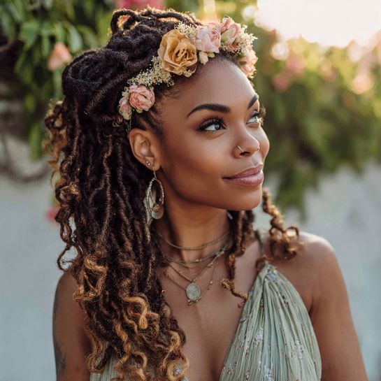 Goddess locs blend the structure of faux locs with the softness of loose, wavy hair left out at the ends. This creates a romantic, ethereal look that’s both protective and effortlessly beautiful.