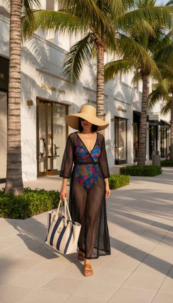 A dramatic mesh maxi over swimwear creates beach-to-boardwalk sophistication.