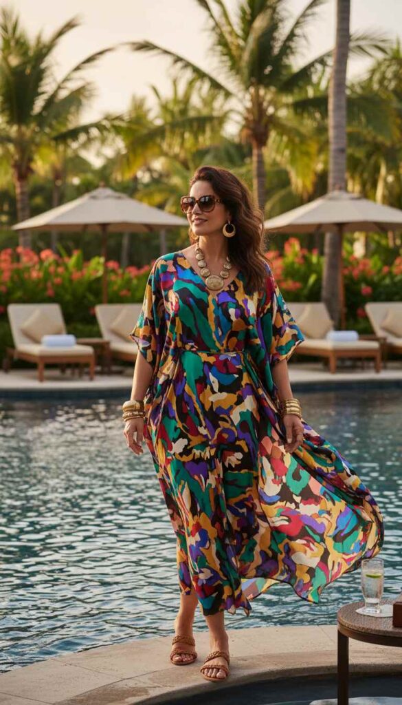 A designer-quality printed kaftan creates effortless resort sophistication.