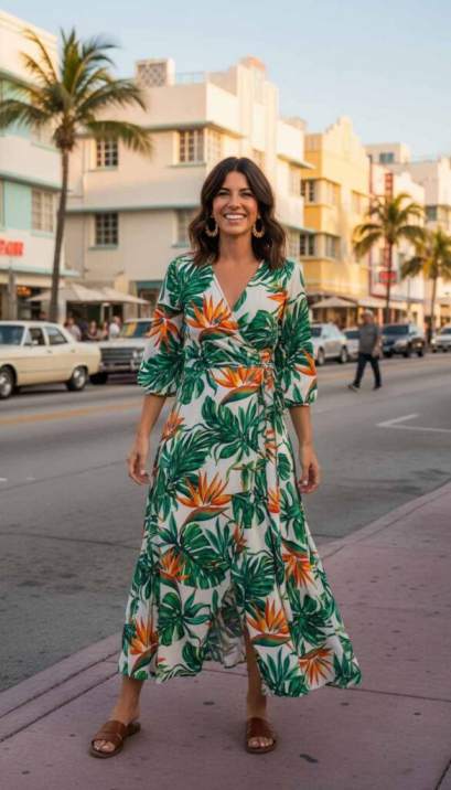 A vibrant tropical print wrap dress channels authentic Miami cultural energy.