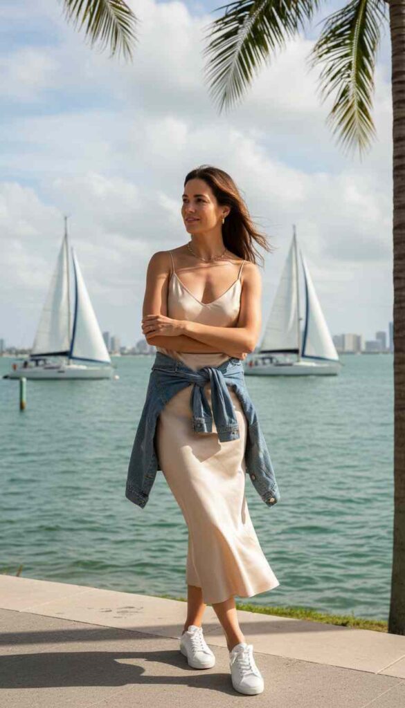 A luxurious silk slip dress with fresh sneakers creates high-low Miami cool.