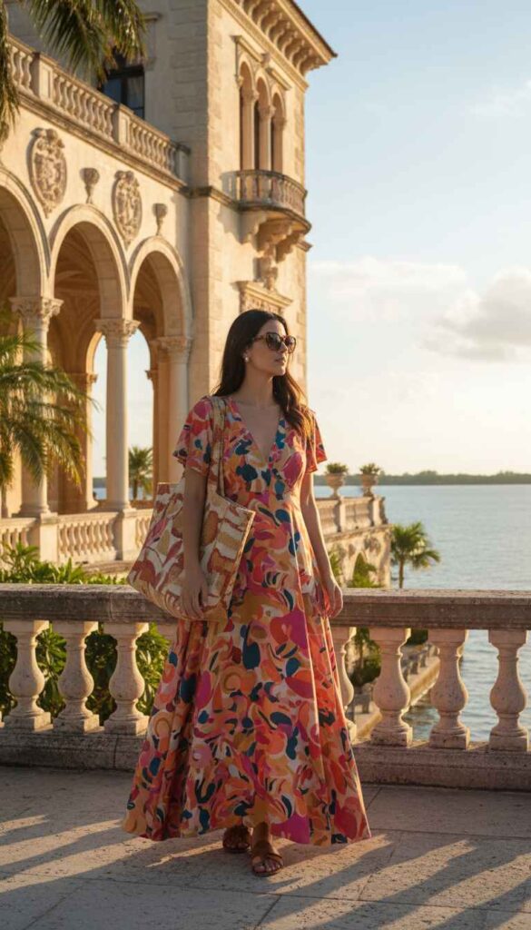 Flowing layers and artisan accessories suit Coconut Grove’s bohemian outdoor markets.