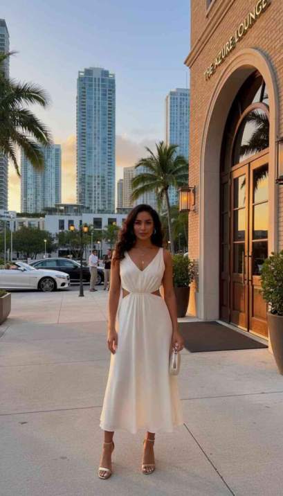 Miami nights begin late and end later—dinner rarely starts before nine, clubs don’t populate until midnight, and rooftop bars host golden hour gatherings that flow seamlessly into evening. This particular social rhythm means evening dressing needs to perform for extended periods in warm conditions while maintaining polish through late hours.