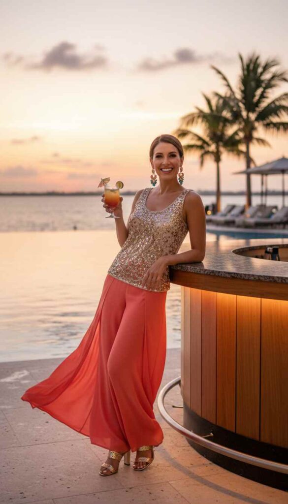 Wide palazzo pants with a beaded top creates resort glamour for poolside or dinner.