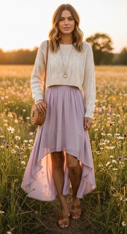 Why It’s Chic: This dynamic silhouette features a high-low hem maxi skirt that’s shorter in front and longer in back, creating beautiful movement. Paired with a lightweight crop sweater for balanced proportions, this look is playful yet polished, perfect for transitional summer moments.