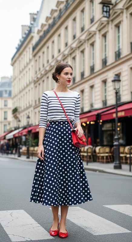 Why It’s Chic: This playful pattern-mixing combination pairs a polka dot midi skirt with a classic Breton striped top for unexpected charm. The contrasting patterns create visual interest while the neutral color palette keeps the look cohesive. It’s French-girl chic with a twist.