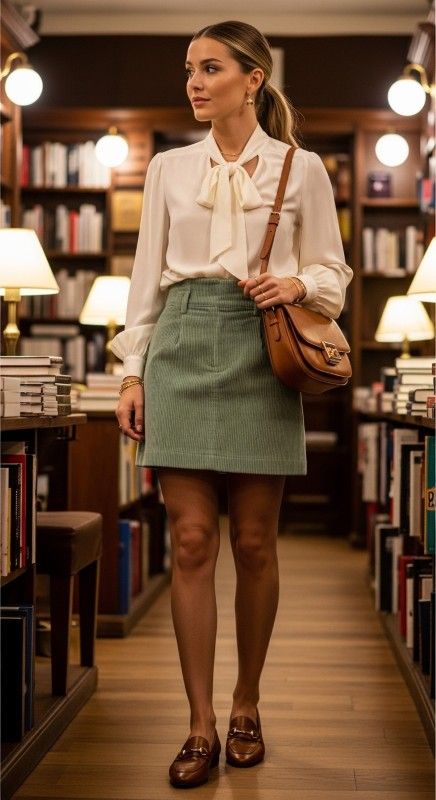 Why It’s Chic: This textural combination pairs a soft corduroy mini skirt with a luxurious silk blouse for interesting fabric play. Loafers add preppy polish while maintaining comfort. It’s tactile sophistication with timeless appeal.