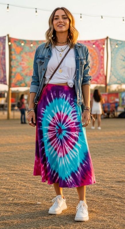 Why It’s Chic: This playful combination features a tie-dye midi skirt with vibrant, one-of-a-kind patterns, balanced by a classic white tee and denim jacket for grounding. It’s free-spirited fun with casual cool, perfect for expressive summer styling.