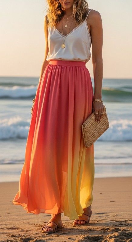 Why It’s Chic: This artistic combination features an ombré dye maxi skirt with seamless color transition that creates beautiful visual flow. Paired with a simple camisole for balance, this look is dreamy, romantic, and perfectly suited for expressive summer styling.