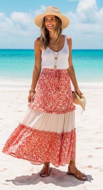 Why It’s Chic: This romantic look features a tiered ruffle maxi skirt that creates beautiful movement and volume, balanced by a simple ribbed tank for proportion. The contrast between the voluminous skirt and fitted top creates visual interest while maintaining comfort. It’s bohemian elegance with modern minimalism.