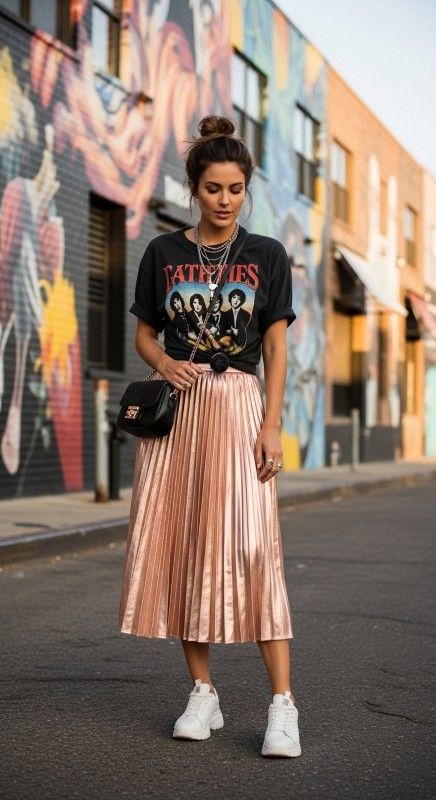 Why It’s Chic: This high-low mix pairs a glamorous pleated metallic midi skirt with a relaxed graphic tee for unexpected cool. The metallic pleats catch light beautifully while the casual tee keeps the look approachable. It’s playful sophistication that works for day or night.