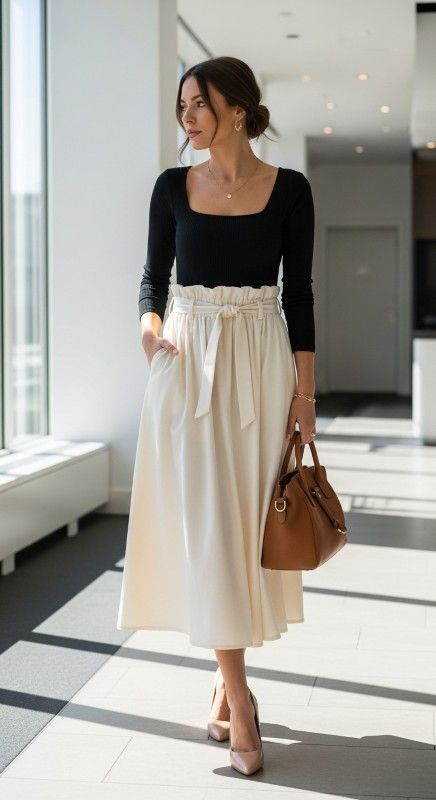 Why It’s Chic: This flattering silhouette features a paperbag waist midi skirt with gathered detailing that defines the waist beautifully. Paired with a fitted bodysuit for a seamless tucked-in look, this combination is polished, proportional, and perfectly modern.