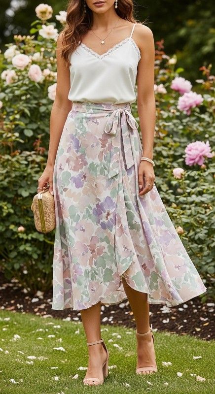 Why It’s Chic: This romantic combination features a floral print wrap skirt with adjustable tie waist for a flattering, customizable fit. The white camisole underneath keeps the look balanced and fresh. It’s feminine elegance with effortless versatility.