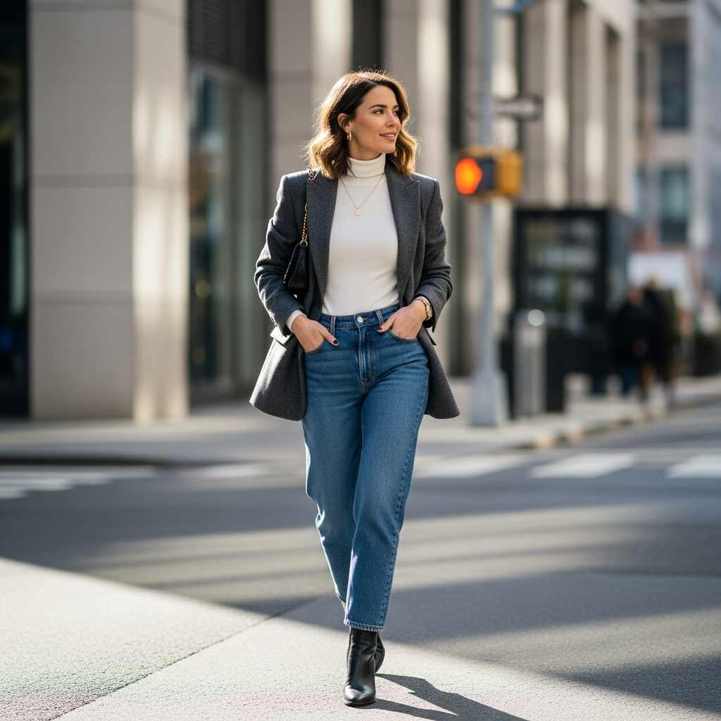 A structured wool blazer instantly elevates casual denim. Choose slightly oversized for a modern feel.
