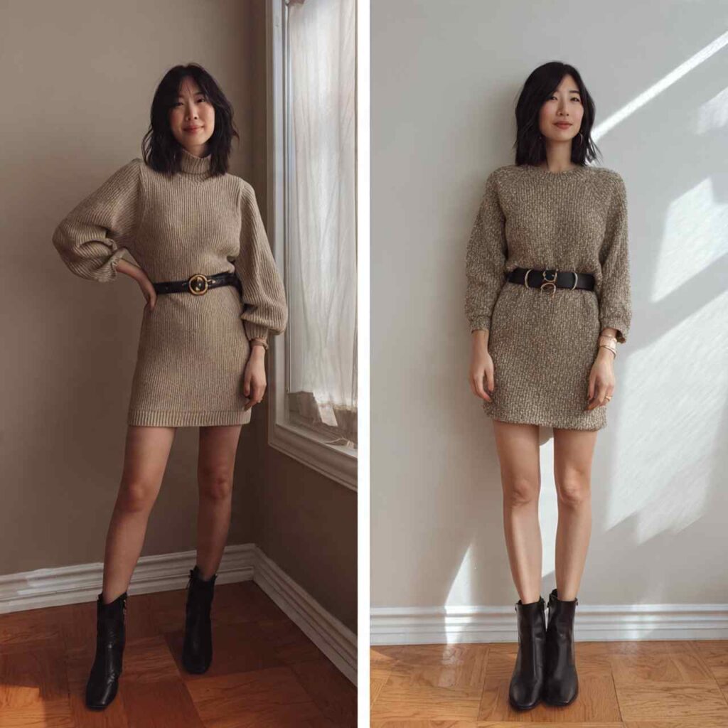 Belting a sweater dress gives instant shape and polish.