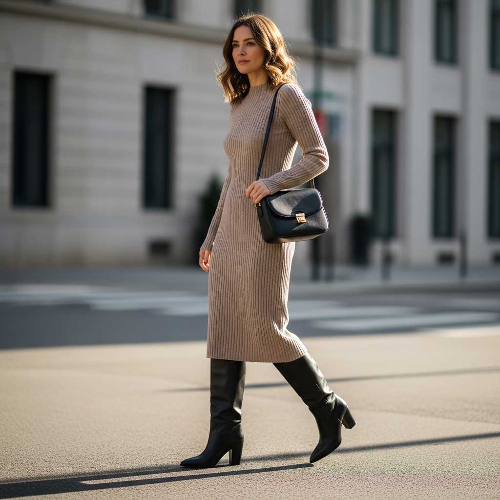 2. Ribbed Knit Dress with Tall Boots