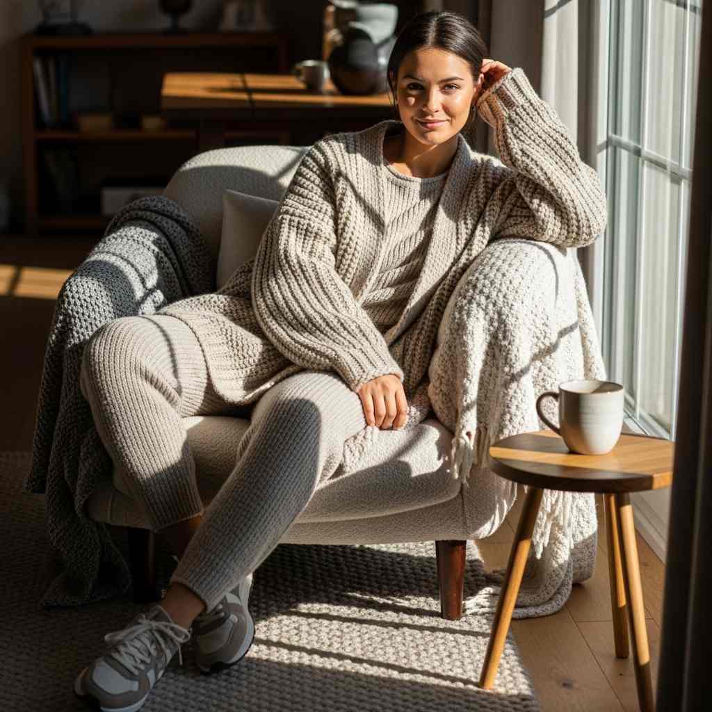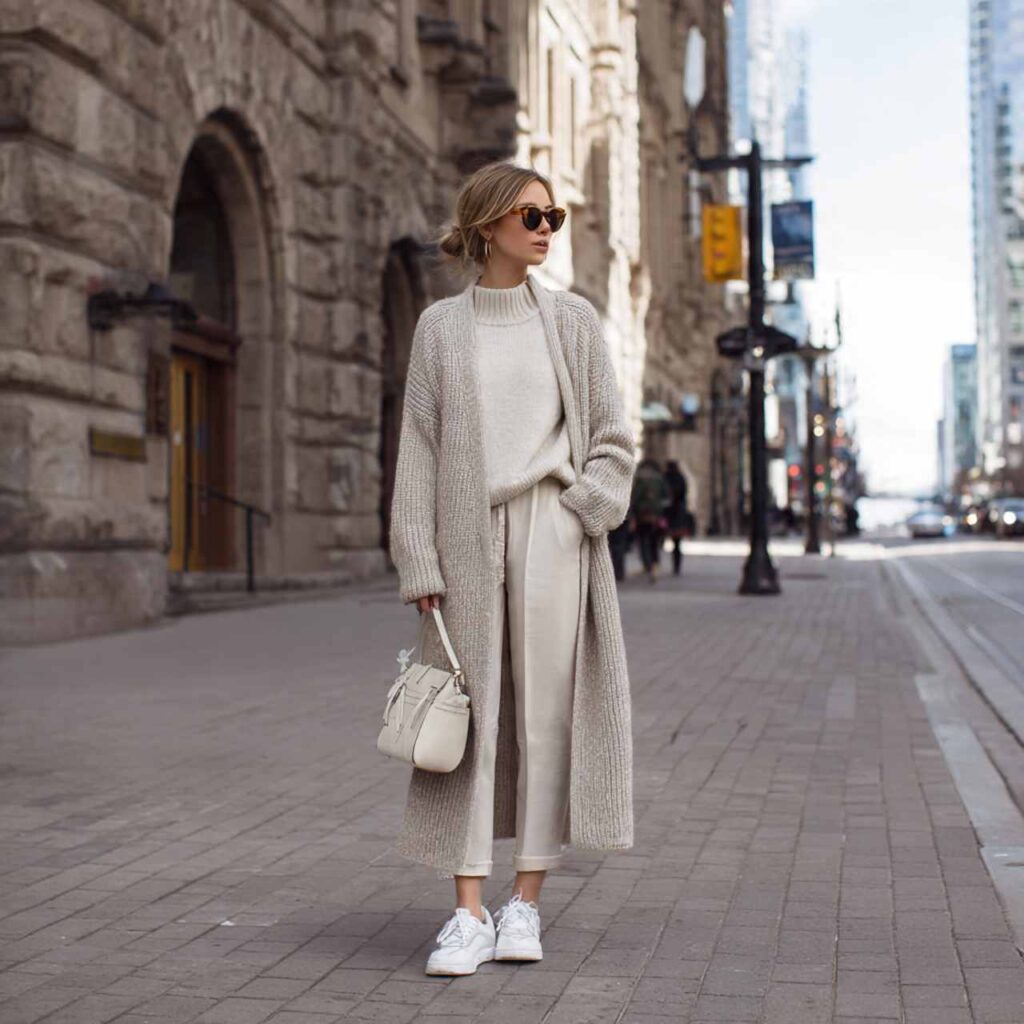 Comfort-first dressing meets style with monochrome knit sets layered under a cozy cardigan.