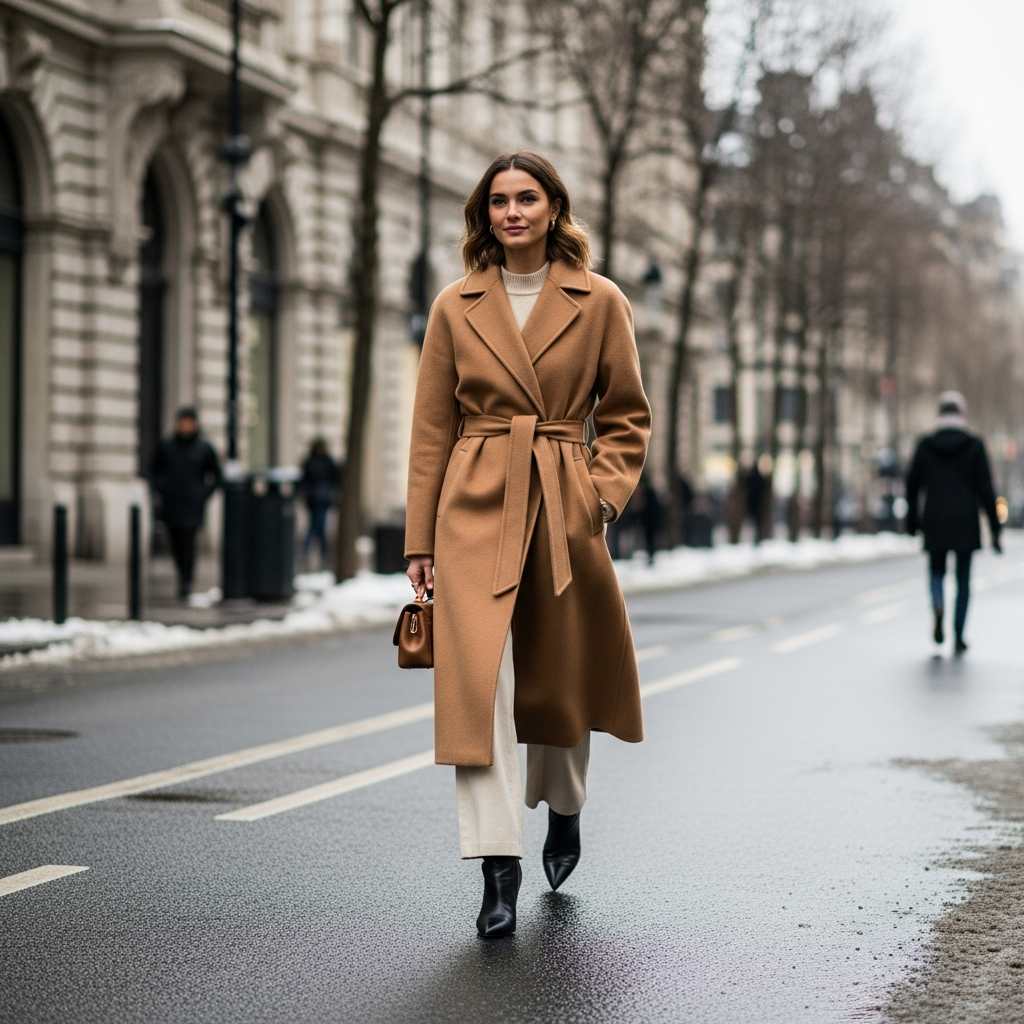 A belted coat sharpens the waist while wide-leg trousers add movement and comfort.