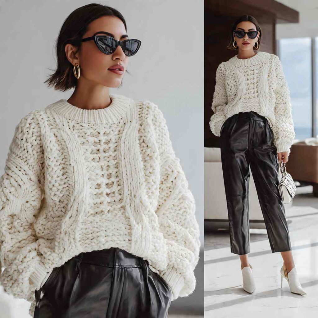 6. Chunky Knit Sweater + Faux Leather Pants