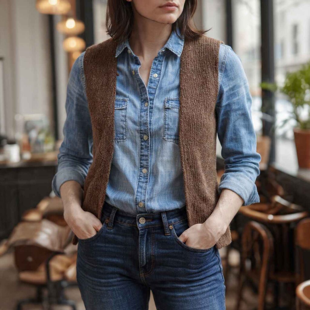 7. Denim Shirt + Knit Vest Layer