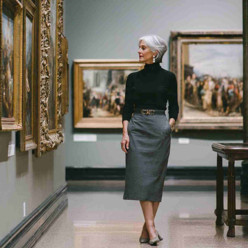 A fine-gauge turtleneck paired with knee-length straight skirt creates sleek sophistication. The covered-up elegance feels appropriately polished.