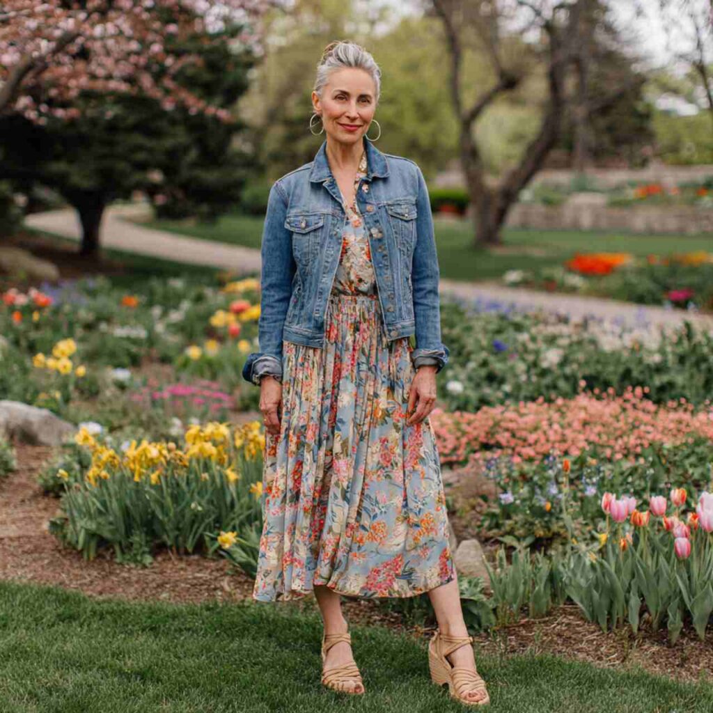 A classic denim jacket layered over spring floral dress creates the perfect blend of casual and feminine, structured and flowing.