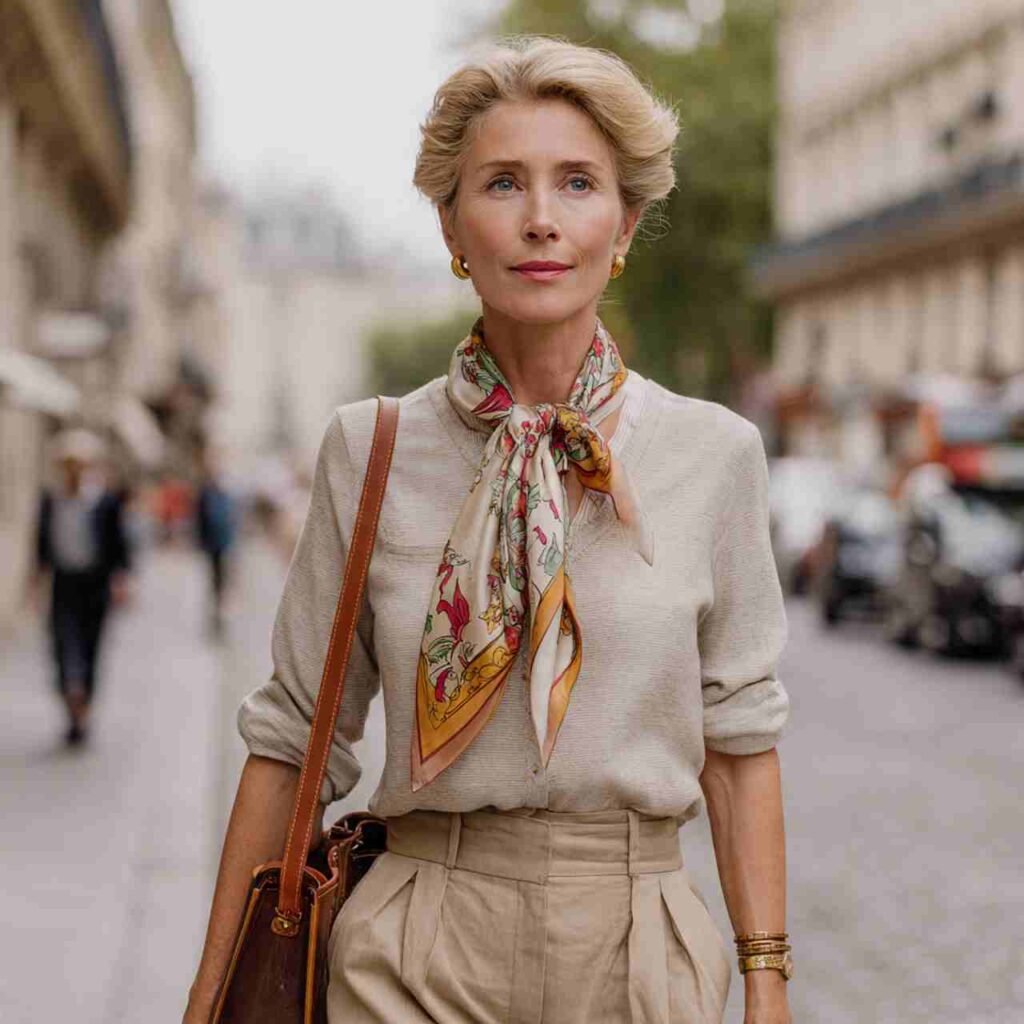A beautiful silk scarf transforms simple neutral outfit—jeans and sweater or dress—into polished ensemble through one thoughtful accessory.