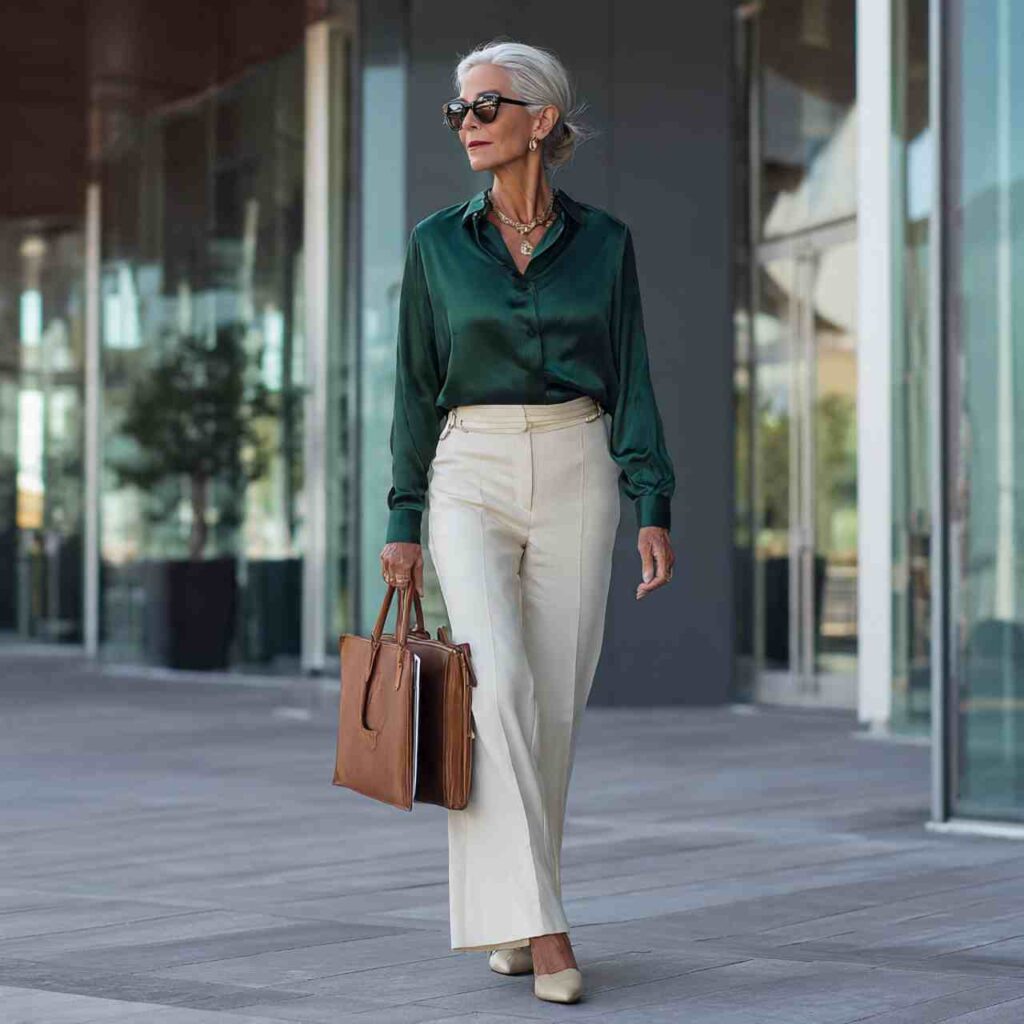 A luxurious silk blouse in jewel tone paired with wide-leg trousers creates elegant proportion and refined polish suitable for professional or social settings.