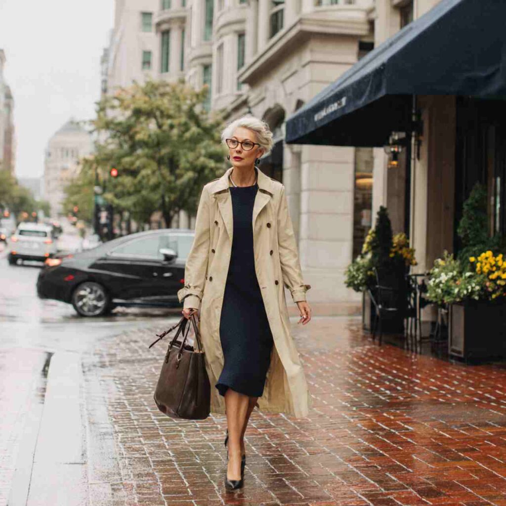 A classic trench coat worn over a simple jersey or knit dress creates effortless polish. The trench does all styling work while dress remains comfortable.
