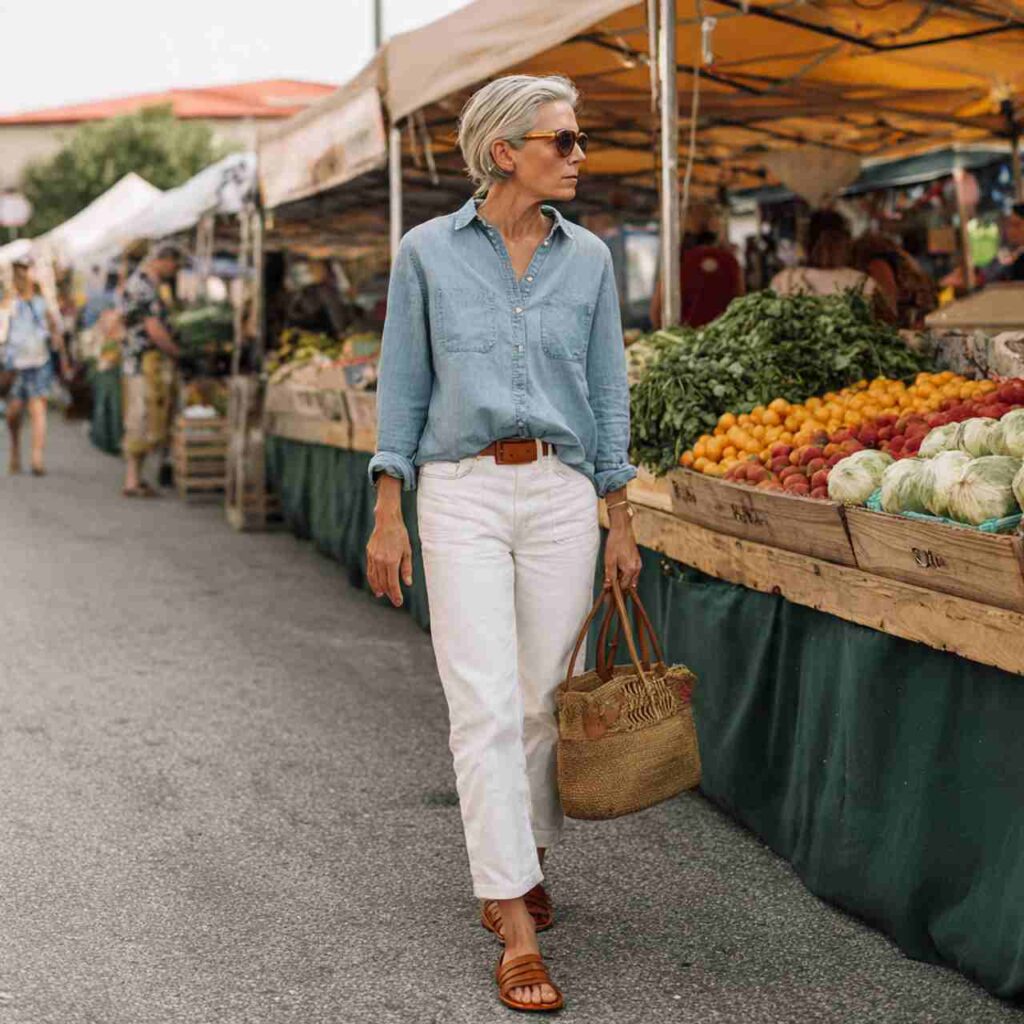 A soft chambray shirt paired with white jeans creates fresh spring crispness. This approachable combination works for casual gatherings and daytime activities.