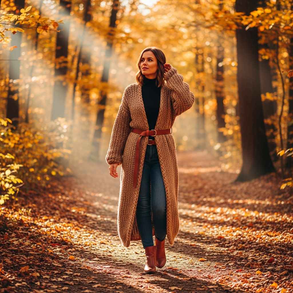 Oversized, chunky knit cardigans in neutral tones are replacing traditional coats for transitional weather and layering. These substantial cardigans reach knee-length or longer and feature oversized buttons, belts, or open fronts.